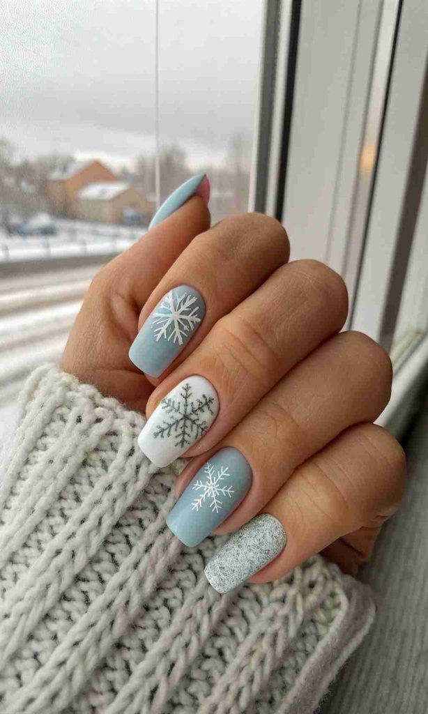 Winter baddie nails mix cool tones with cozy elegance. Think silver sparkles, icy blues, and snowy white details that shimmer under soft light. They match the mood of winter perfectly—quiet yet radiant.