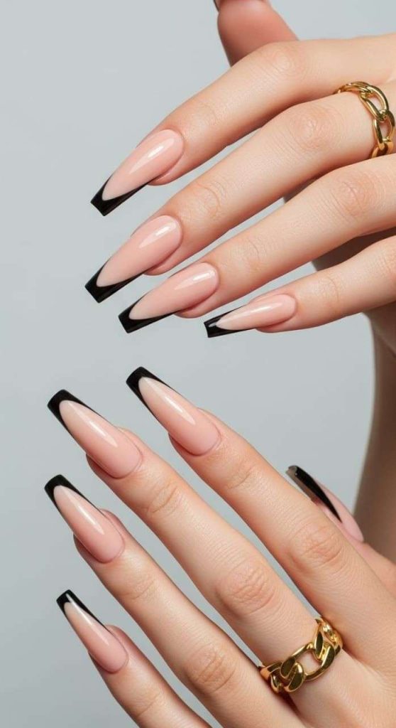 Black French tips feel edgy, clean, and modern. The contrast between the nude base and the black line looks sharp and stylish.
