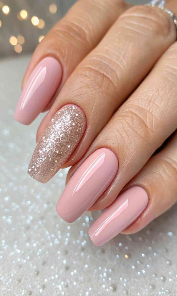 A glitter accent nail adds sparkle without being too much. Most nails stay nude or pink, and one nail shines like jewelry.