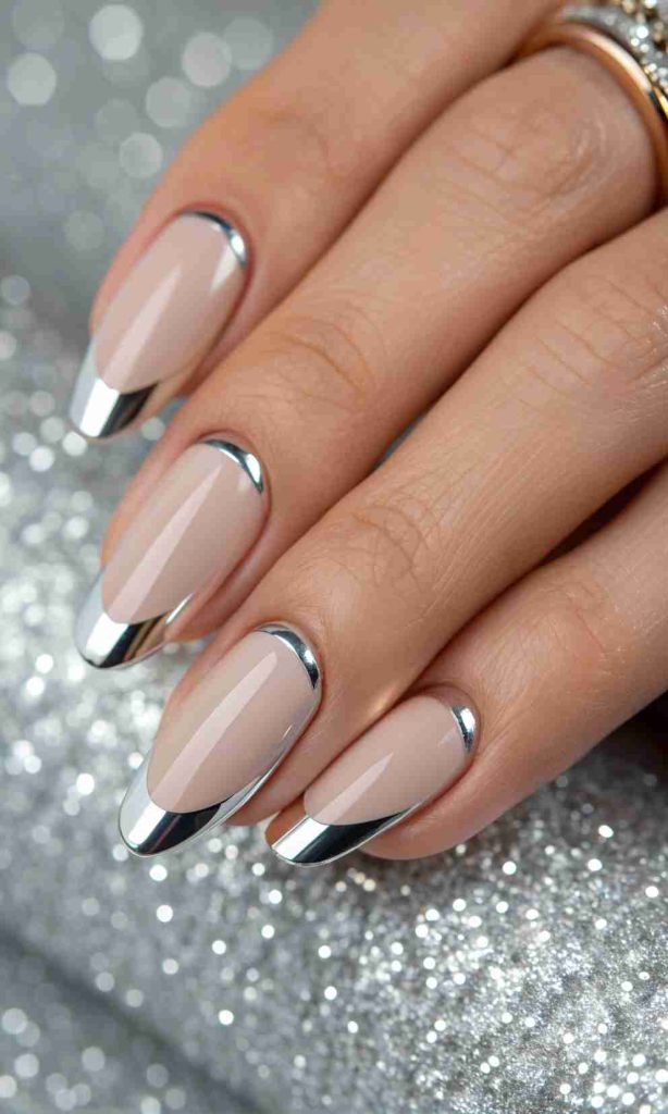 Chrome tips give you that shiny, mirror look just at the ends of your nails. The base stays soft and nude, so the chrome stands out in a classy way.