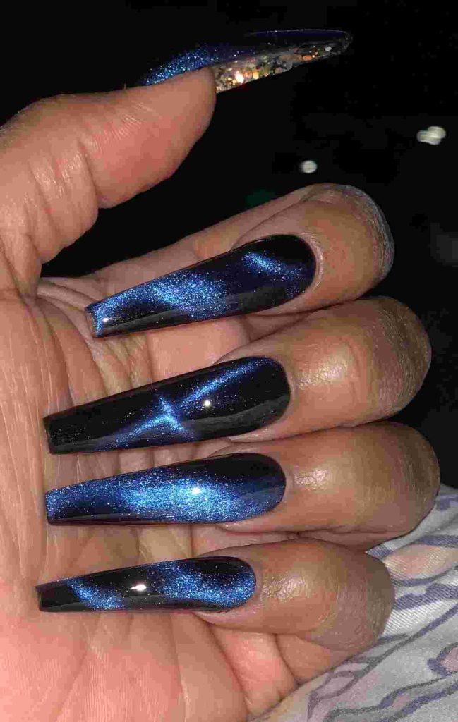 On ballerina nails, the cat eye effect looks long and dramatic in the best way. It’s a great pick for nights out, dinners, or anytime you want your nails to do the talking.