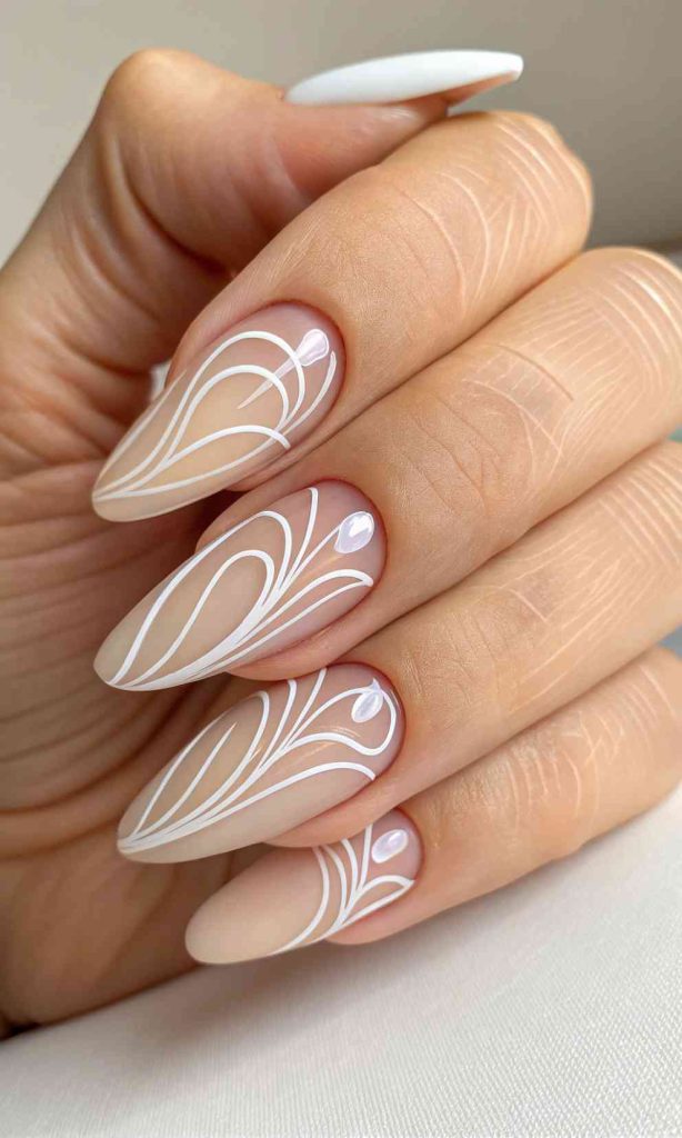 White swirl nails have clean, curvy lines that look light and artsy. The swirls feel playful, but the white keeps it neat and calm.