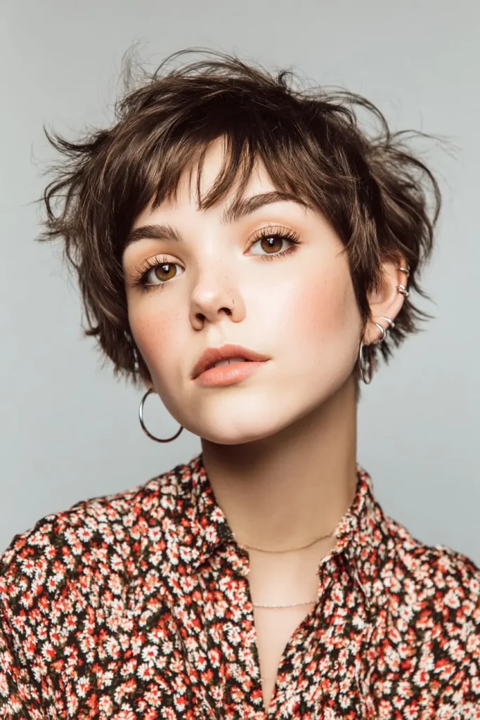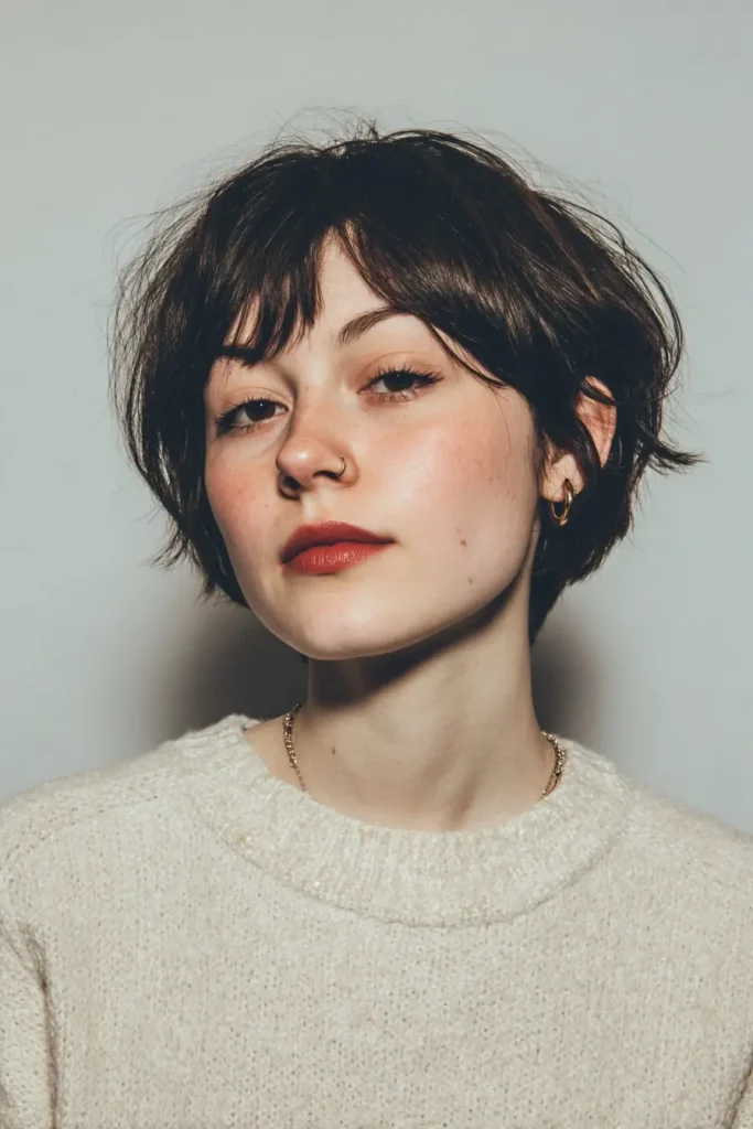 This bixie has uneven layers and a slightly messy finish. It gives a bold and cool look that feels fun and full of character. It is great for anyone who likes a relaxed and edgy hairstyle.