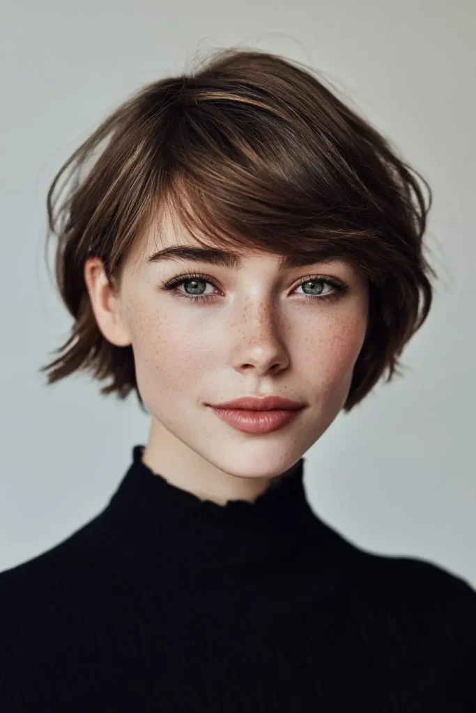 Curtain bangs bring a soft and trendy touch to the bixie. They open around the face and create a very flattering shape. This style mixes old-school charm with a fresh modern feel.