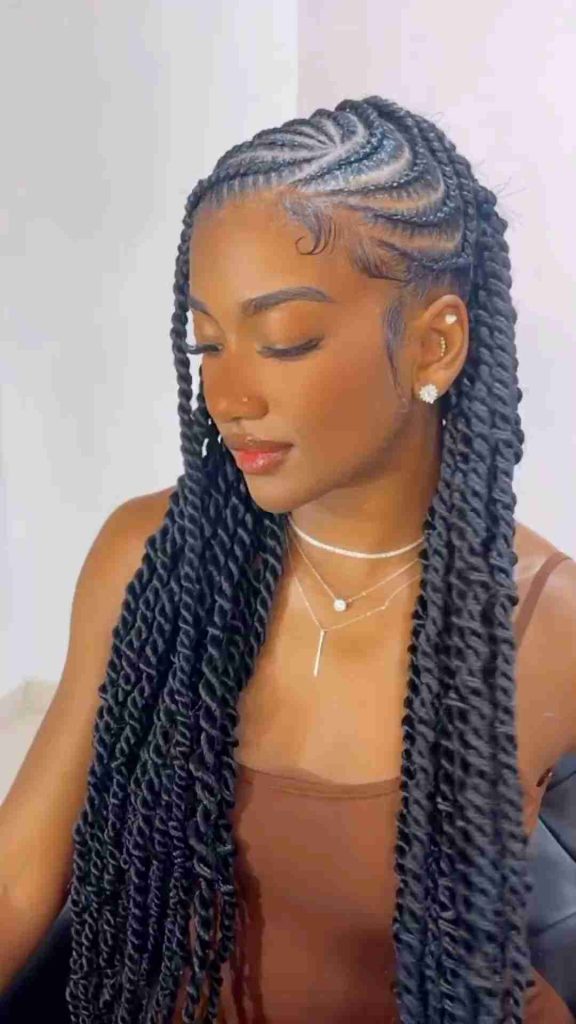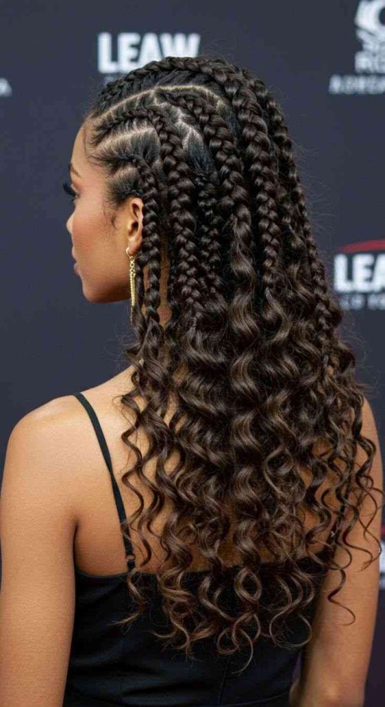 Cornrow braids with curls offer the best of both worlds—neat braids in the front and soft curls in the back. This combination of texture adds movement and personality. It’s one of the most loved cornrow hairstyles for women who want a look that’s natural, lively, and full of charm.