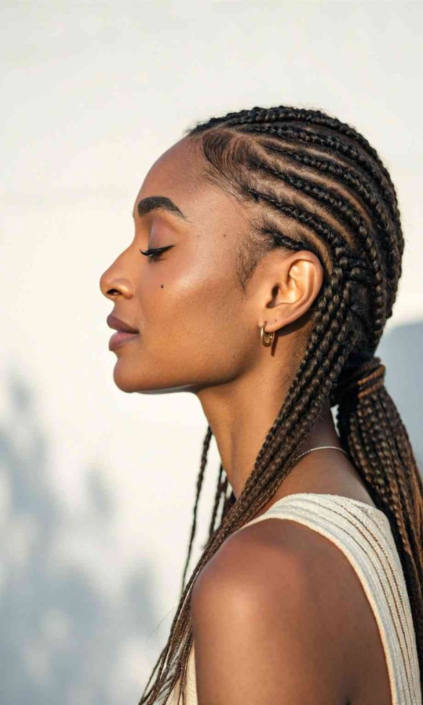 The straight back cornrows style is a classic that never fades. The braids run evenly from the forehead straight to the back of the head, giving a smooth and confident appearance. It’s one of the simplest cornrow hairstyles, yet it makes a strong statement of beauty and strength with minimal effort.