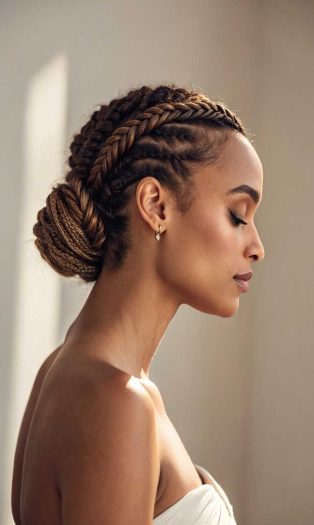 Cornrow updo styles are graceful and refined, pulling the braids upward into buns or twisted crowns. This form of cornrow hairstyles suits formal occasions yet stays practical for everyday elegance. It’s a great way to lift the face and highlight natural beauty while keeping hair secure.
