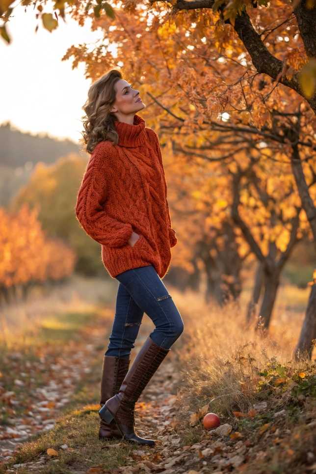 This outfit is great for outdoor events or relaxed evenings. It brings both comfort and fashion to cooler fall days.