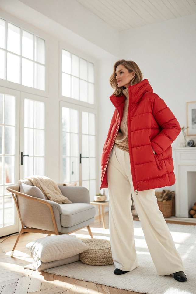 Choose a red or bright puffer jacket for an eye catching effect. Pair it with cream or beige wide leg trousers to keep the balance clean and chic.