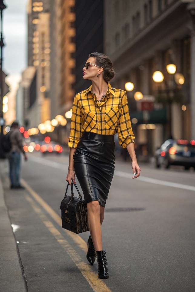 Choose a yellow or red plaid shirt tucked into a sleek black skirt. Pair with boots or sneakers for a versatile finish.