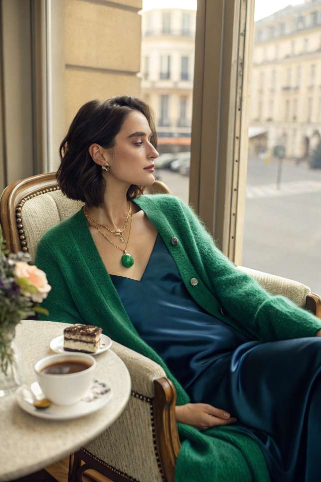 Go for an emerald or burgundy sweater over a satin dress for fall tones. Add boots or heels depending on the occasion.