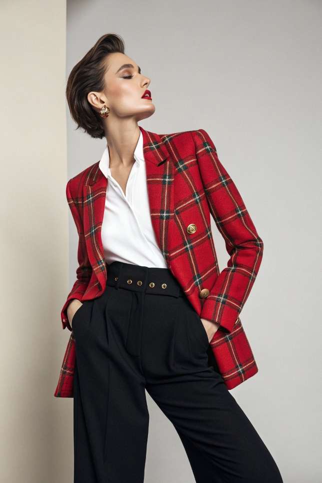 You can style it with a plain top or a turtleneck underneath. Bold plaid colors like red or green make the outfit stand out, especially when paired with dark trousers. Add loafers or boots to keep the look classic.