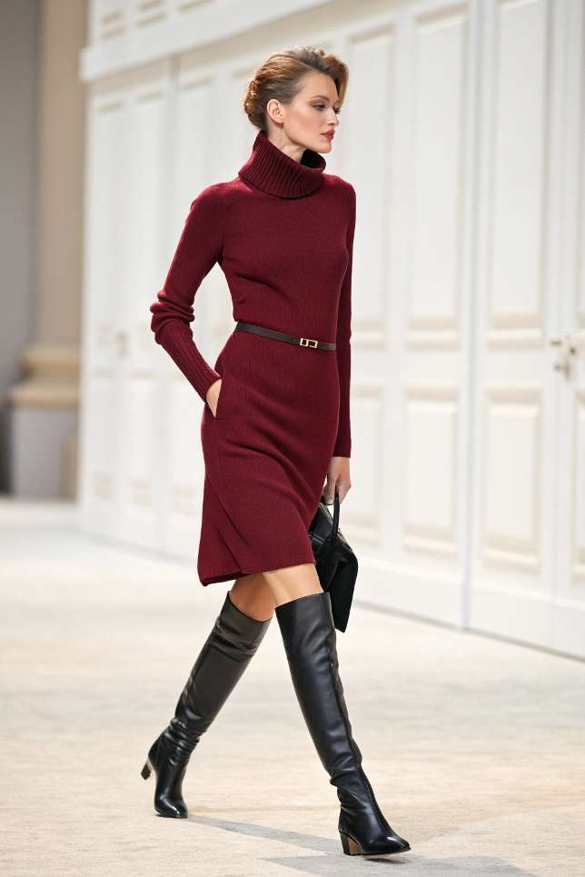 A turtleneck dress paired with knee high boots is a stylish fall outfit that blends warmth with elegance. The dress hugs comfortably while the boots give it a bold finish. It is a perfect outfit for chilly evenings.