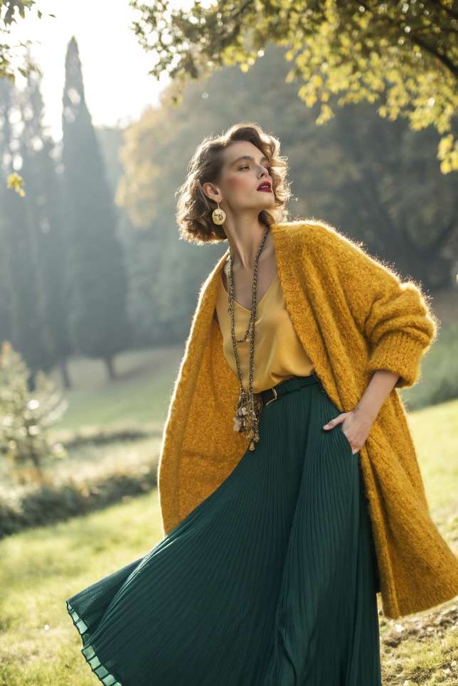 Go for bold cardigans in colors like mustard or deep teal to add life to the look. A neutral skirt balances the outfit and keeps it wearable. Pair with boots or flats depending on the vibe you want.