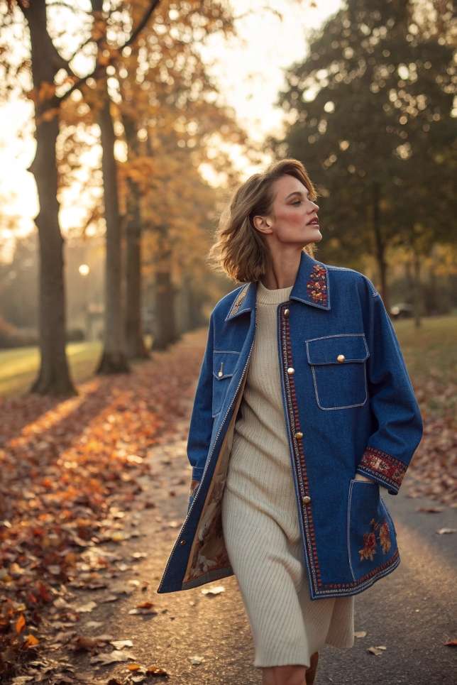 A denim jacket with a sweater dress is an easy and stylish fall outfit. The denim adds a casual edge while the sweater dress keeps you cozy. Together they create a relaxed yet chic look.