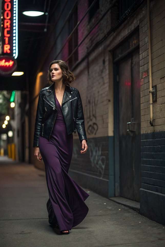 Choose a black leather jacket with a plum or burgundy maxi dress for rich seasonal tones. Boots or sneakers can be added depending on the mood you want to create.