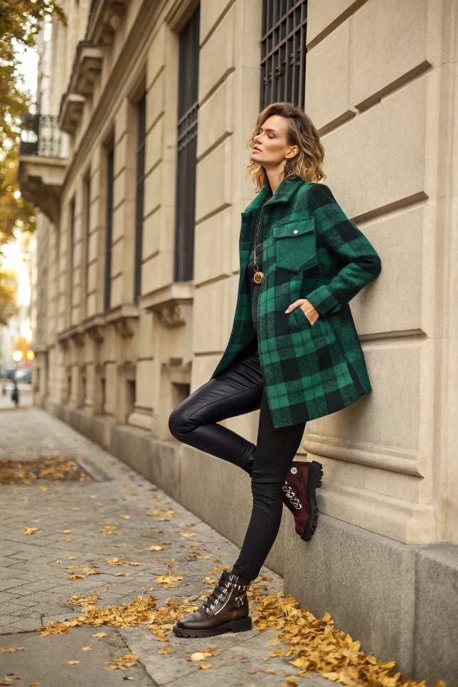 Plaid or solid colored shackets in bold hues like green or red look great against black leggings. Add boots or sneakers for an effortless finish.