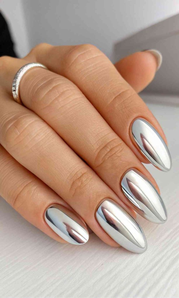 Almond chrome nails look sleek and shiny, like a little mirror on your fingertips. The almond shape makes your fingers look longer, and the chrome finish catches the light every time you move your hand.