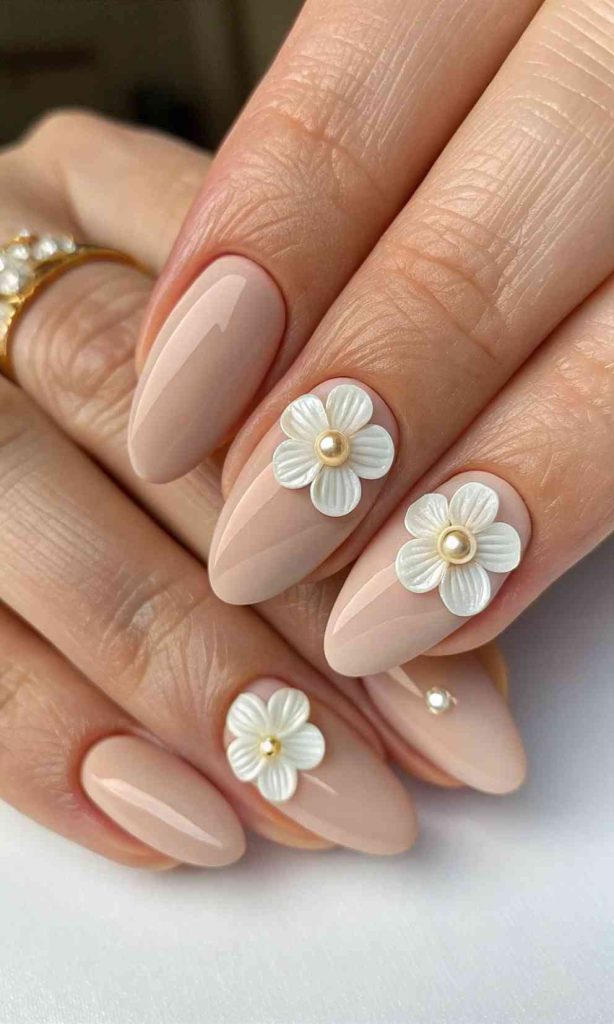 3D flower nails add cute raised petals that look like tiny real flowers on your nails. They feel special and detailed, but they can still look soft and delicate with nude tones.