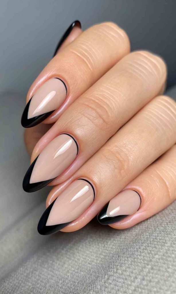 Black tip almond nails feel sharp, clean, and fashionable. The nude base keeps it soft, and the black tips add a bold twist that looks super sleek.