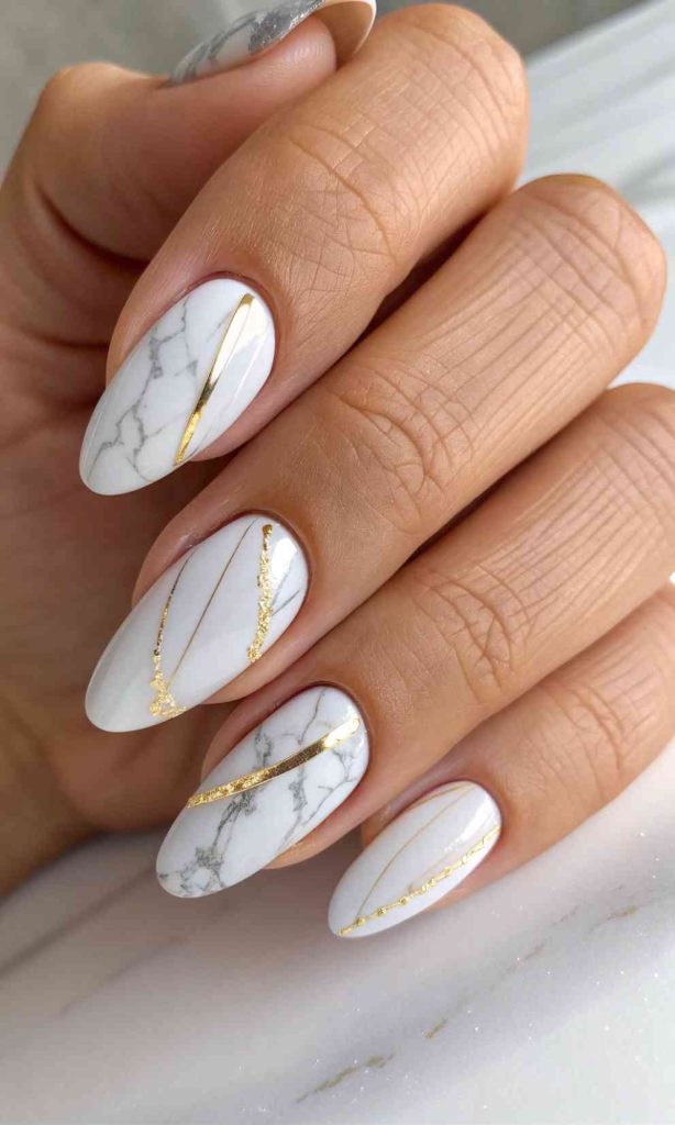 Marble white gold nails look classy and expensive without going over the top. The white marble effect adds detail, and the small touches of gold give it a pretty sparkle.