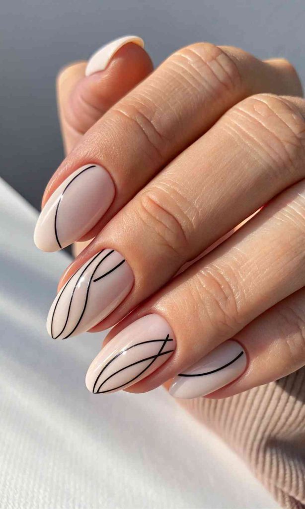 Short square swirl nails are modern and artsy, but still easy to wear. The swirl lines add movement and style, and the nude base keeps everything clean.