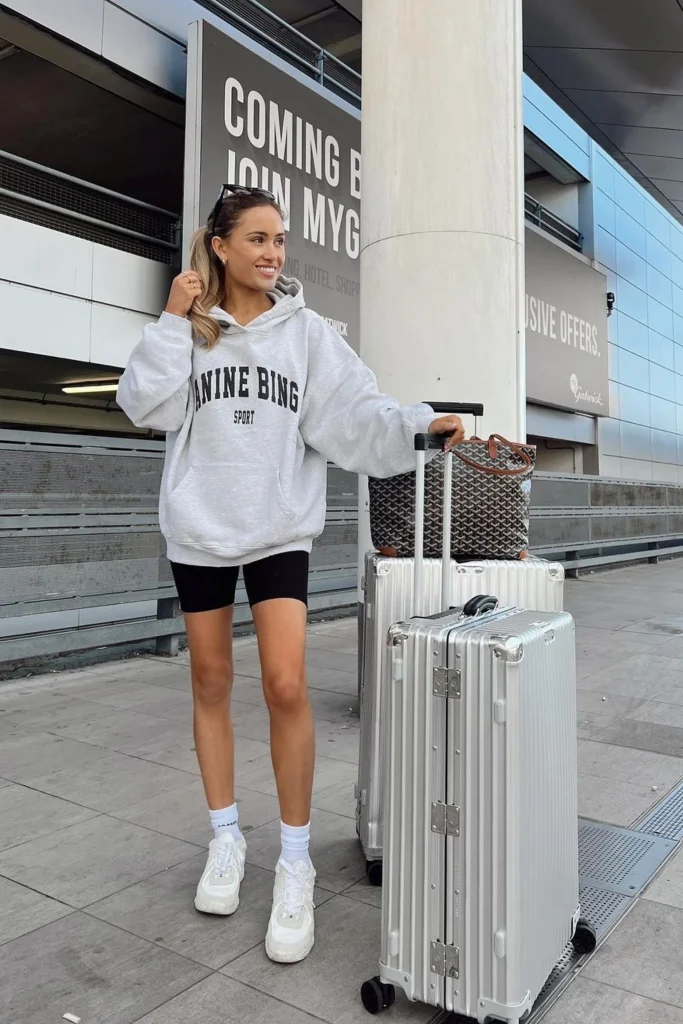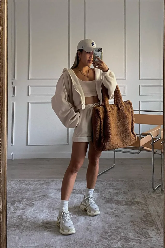This is one of the most popular and comfy hoodie outfit ideas. Wearing a hoodie with cycling shorts is great for warm weather when you still want to feel cozy on top but cool on the bottom. This outfit lets you move easily and feels light on the body. You can wear it to the gym, to run errands, or just to relax at home.