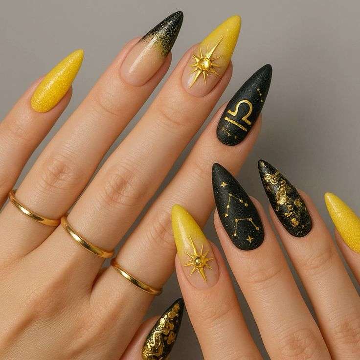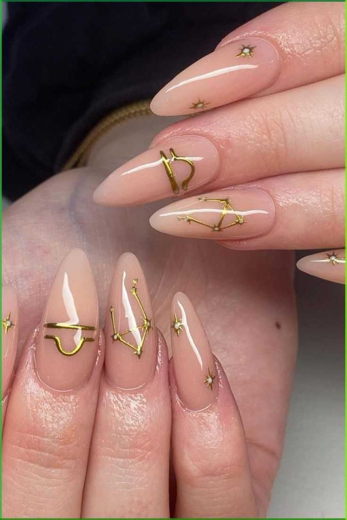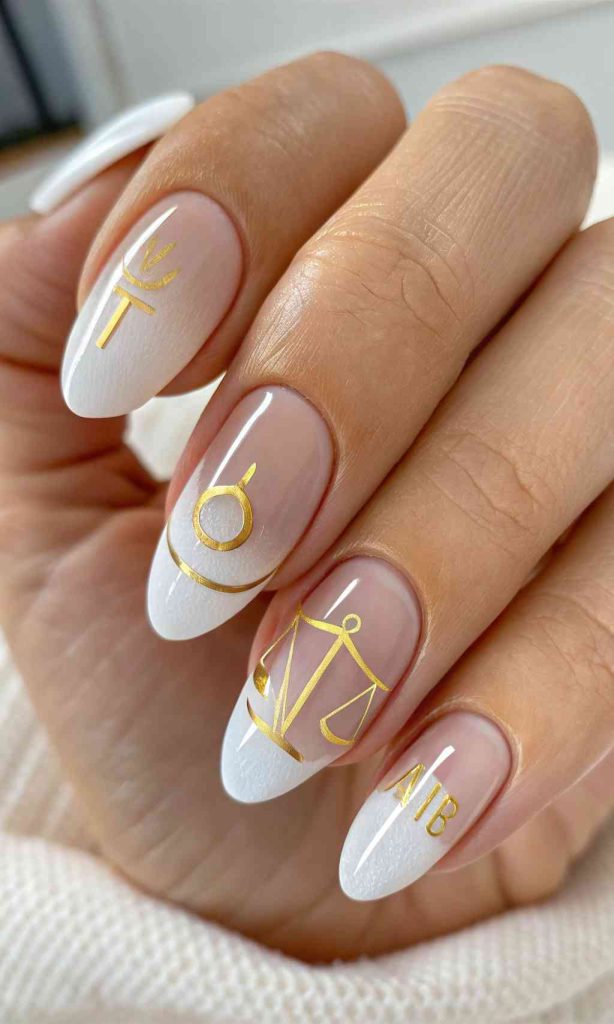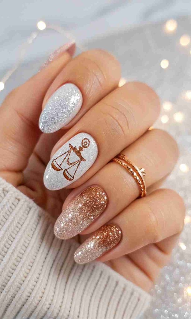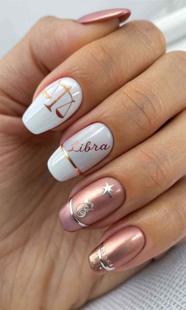 Gold and white Libra nails bring out an elegant glow. The golden touch shows a warm shine, and white polish keeps the design clean and neat. These colors together feel calm yet rich, just like the gentle power of a true Libra. Libra nails in gold and white easily fit for both parties and peaceful days.