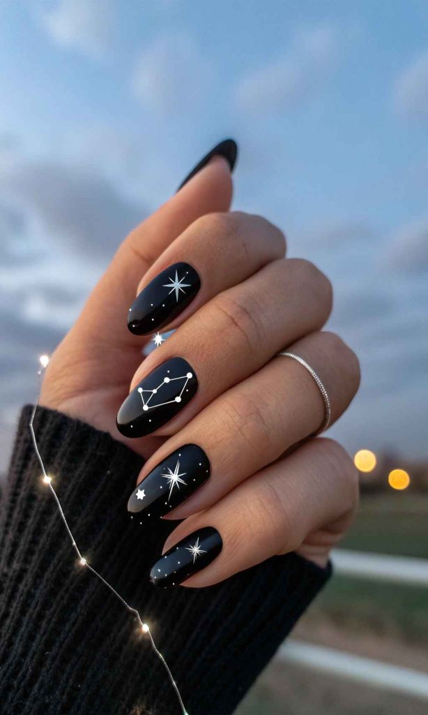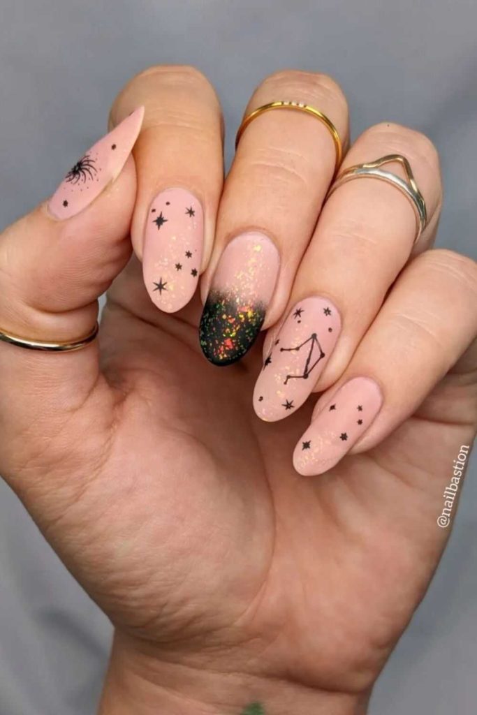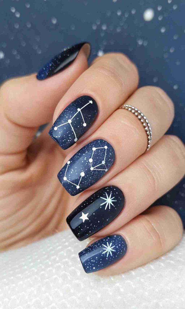 Libra constellation nail art gives your fingers a bit of the night sky. The nails sparkle with small stars and fine silver lines that form the Libra pattern. It feels dreamy and soft, making every hand look elegant. Libra nails like this style show the calm beauty that shines quietly, not loudly, yet still catches every eye.