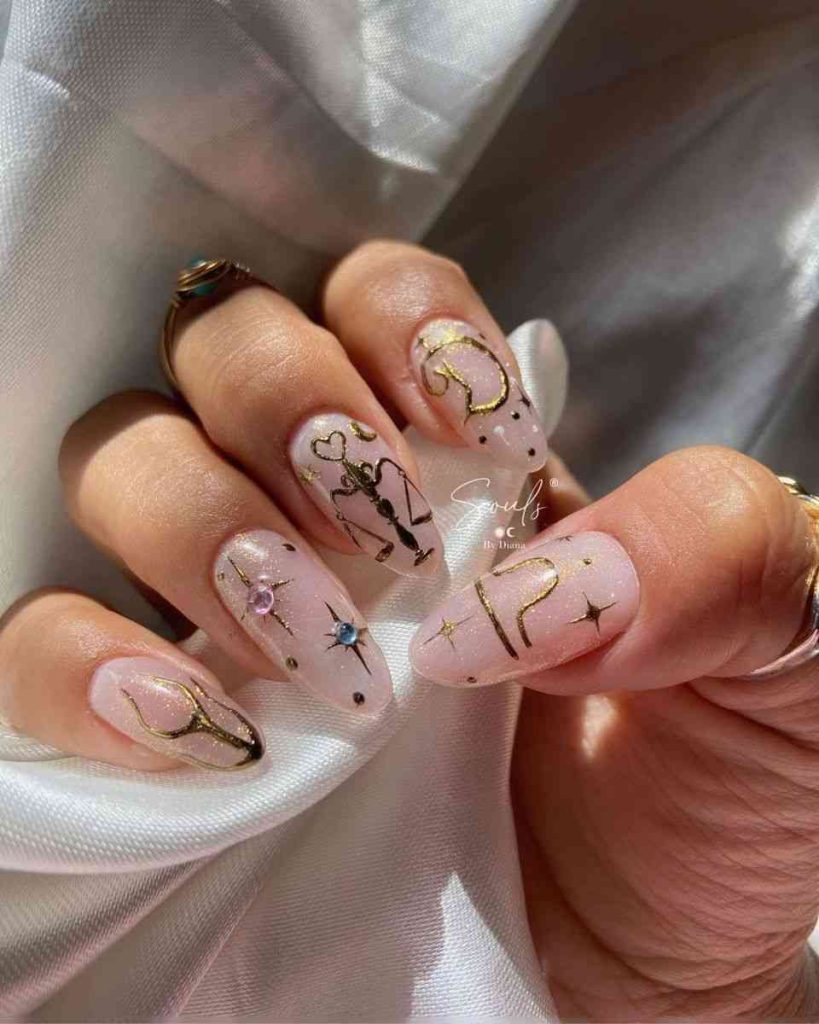 Libra themed nails mix art and balance in one picture. They might have little scales or curved lines, all made in soft tones. This style feels friendly and calm, showing the gentle heart of Libra people. Libra nails with this theme help each hand look well cared for, stylish, and thoughtful.