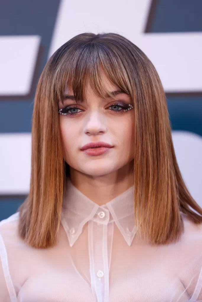 This look works well on straight hair because it keeps the lines smooth. The bangs frame the eyes, giving a stylish and youthful touch.