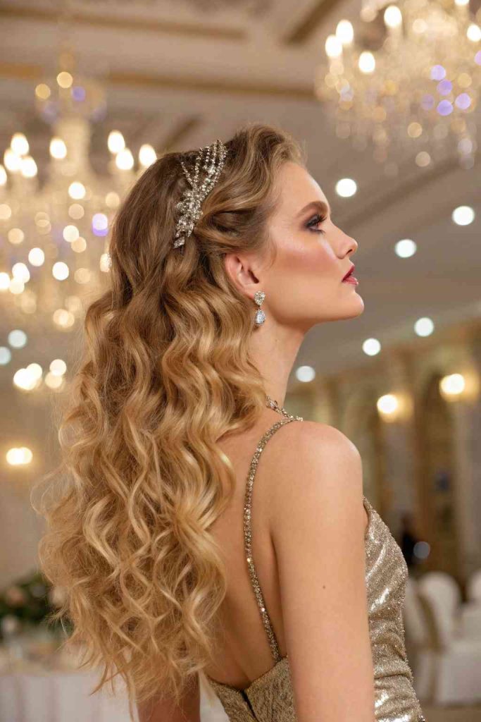 Half-up styles with loose curls can also add a tender and feminine feel. The look pairs beautifully with soft makeup and glowy lights, making it one of the sweetest New Years hairstyles for romantic evenings.