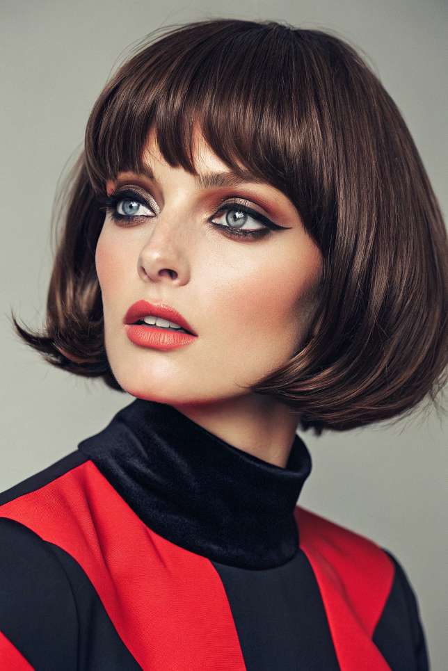 This hairstyle works well with most face shapes. It can make your face look slimmer and your features more balanced. Overall, the Classic Shaggy Bob with Full Bangs is a safe and fashionable choice.