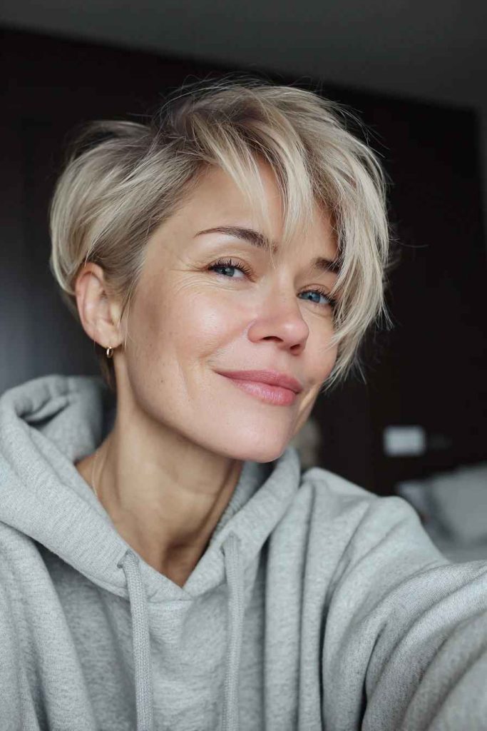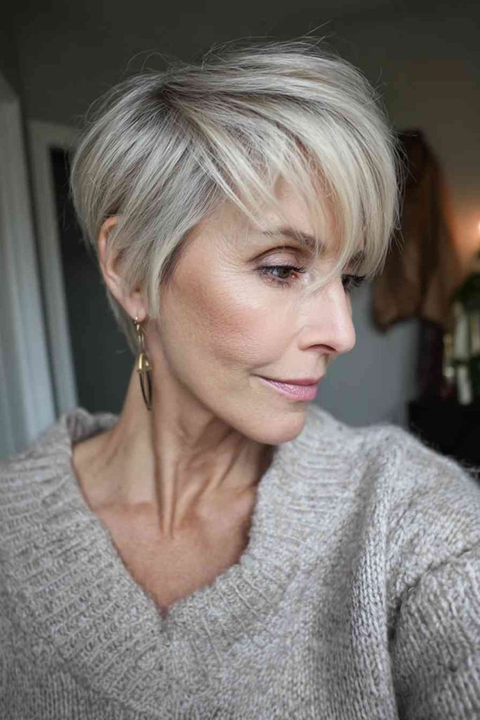 Color matters too. Blonde tones, soft silver, warm brown, and gentle highlights add depth and light, which makes fine hair appear thicker. That is why Short Haircuts for Women Over 50 with Fine Hair often look fresher, lighter, and easier to manage than longer styles.
