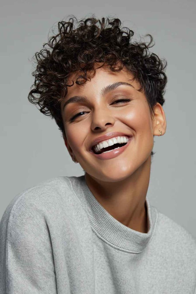 A tapered curly pixie keeps the sides neat while leaving more curl volume on top. This creates a shape that feels bold, clean, and easy to manage.