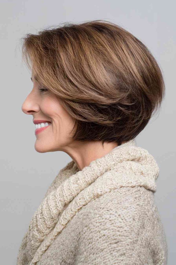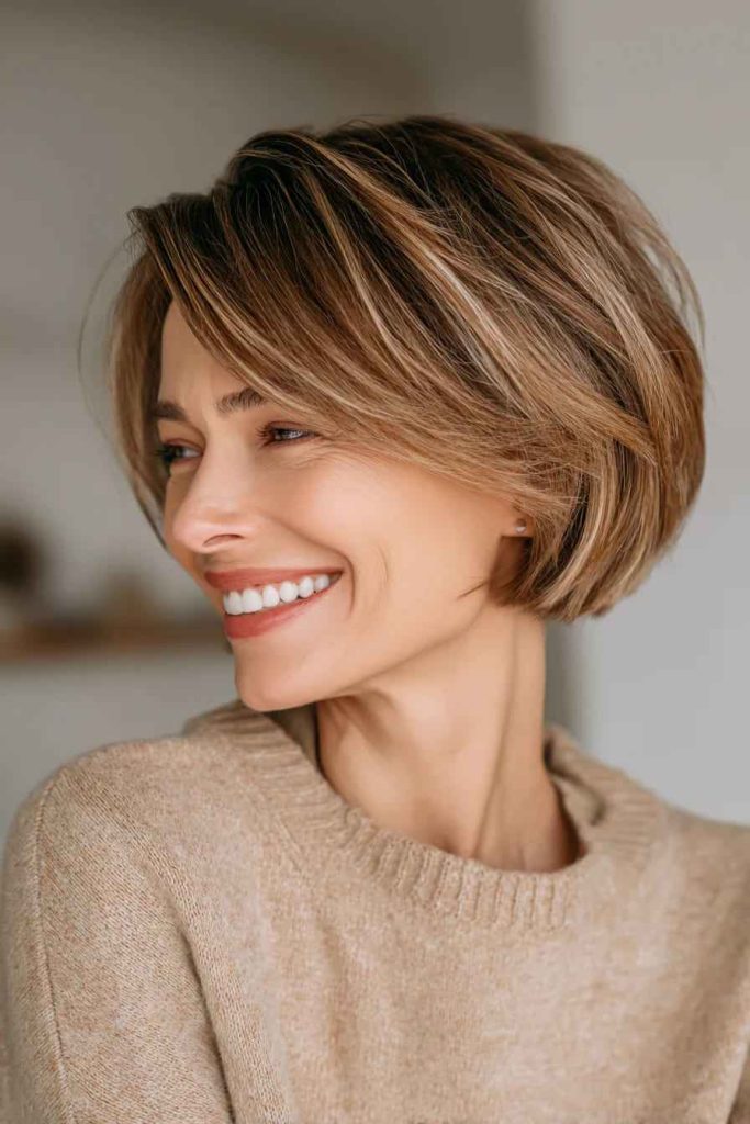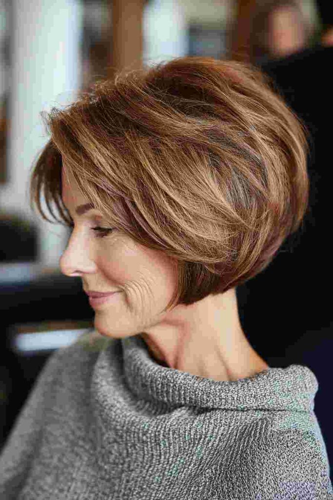 Subtle highlights in toffee brown add warmth and soft depth. This style is perfect for older women who want short hair with a natural glow and gentle dimension.