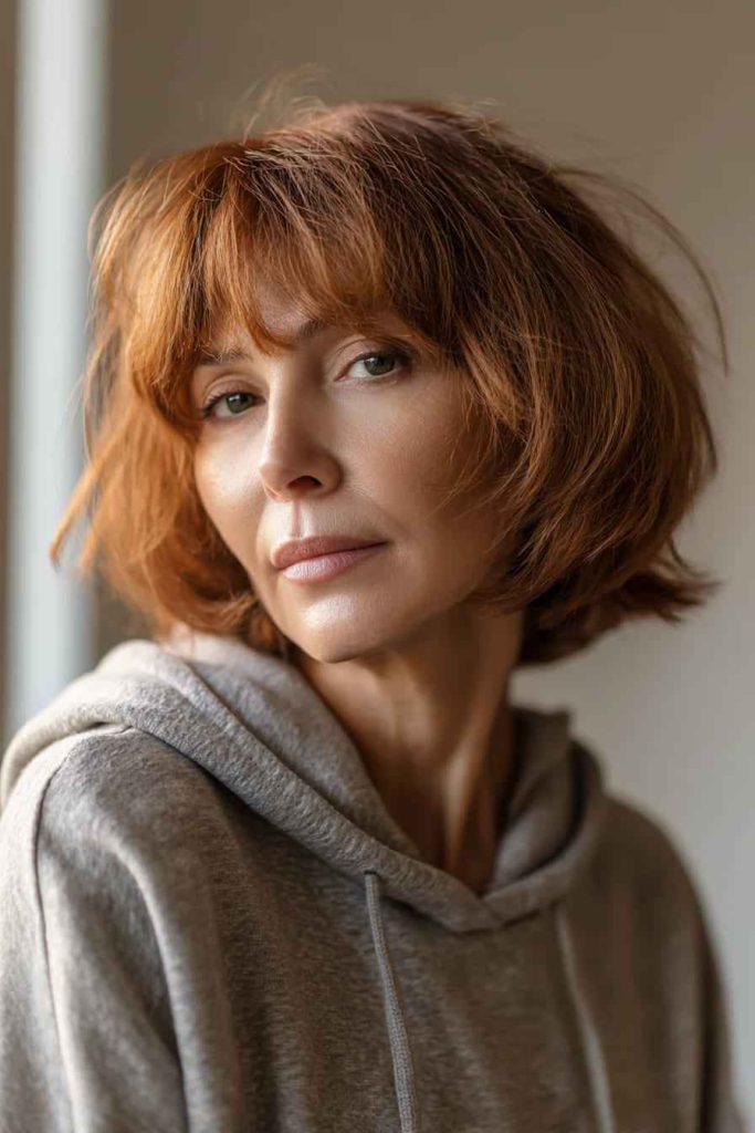 Wispy bangs soften the face and draw attention to the eyes. The deep auburn shade adds warmth, making this one of the most charming short hairstyles for older women.