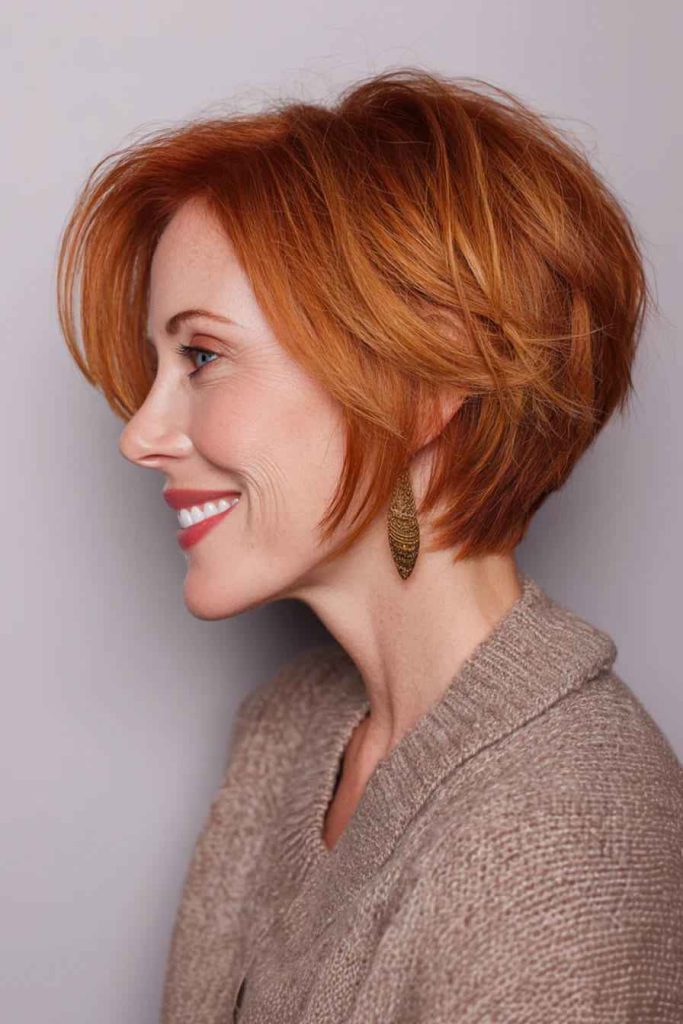 Soft copper brown keeps the haircut warm and balanced. It is a nice choice for women who want short hairstyles for older women with a little trend and character.