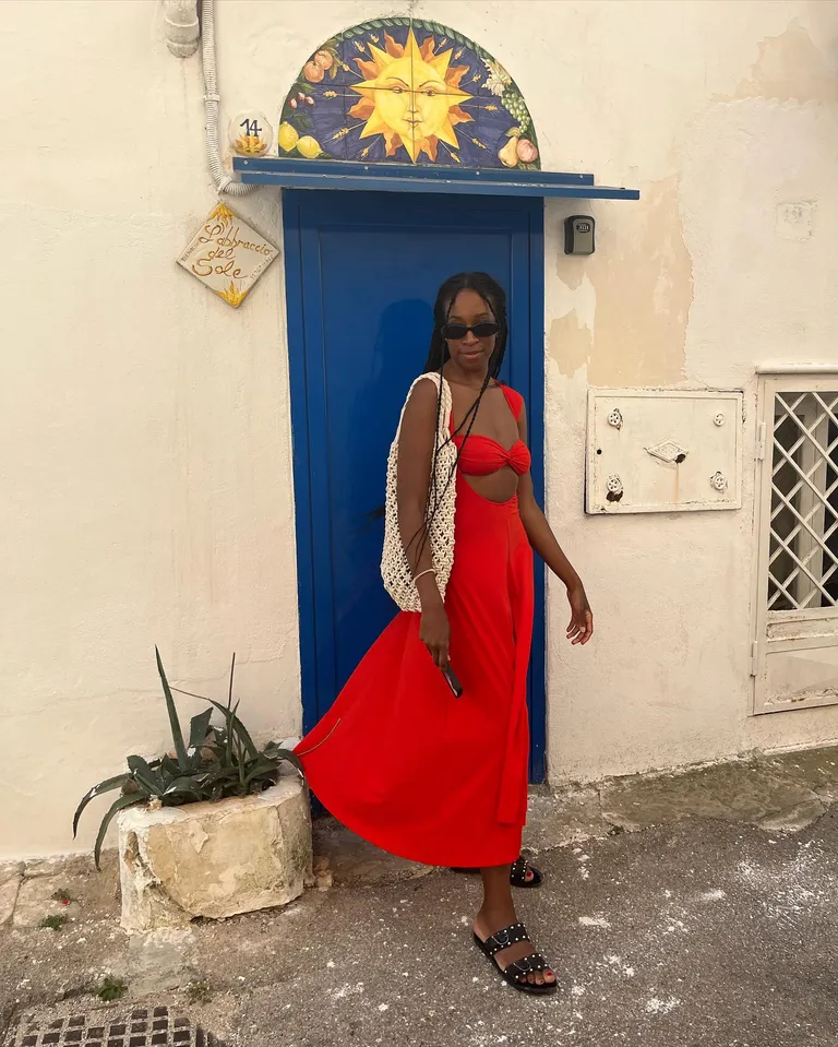 This outfit is a perfect pick for a beach vacation. The red dress feels light and flows nicely when you walk. It has stylish cutouts that make the look fun and fresh. Black sandals are easy to wear and feel great for walking around, especially when it’s hot outside.