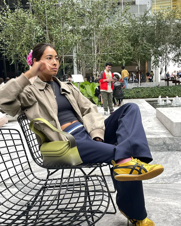 The yellow sneakers are bold and fun. They add color and make the outfit stand out. The green bag adds even more color and makes it easy to carry your things. This look is both fun and useful, and perfect for busy travel days.
