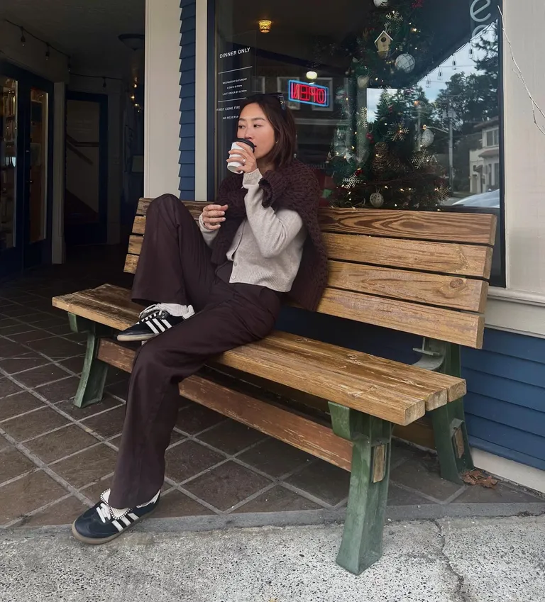 This outfit is a must-have for travel days or just feeling cozy and relaxed. The matching brown sweater and pants look nice together and feel super soft. You don’t have to think much about what to wear because the top and bottom already match. The soft cardigan adds warmth, and the adidas sneakers keep your feet comfortable for walking or moving through the airport.