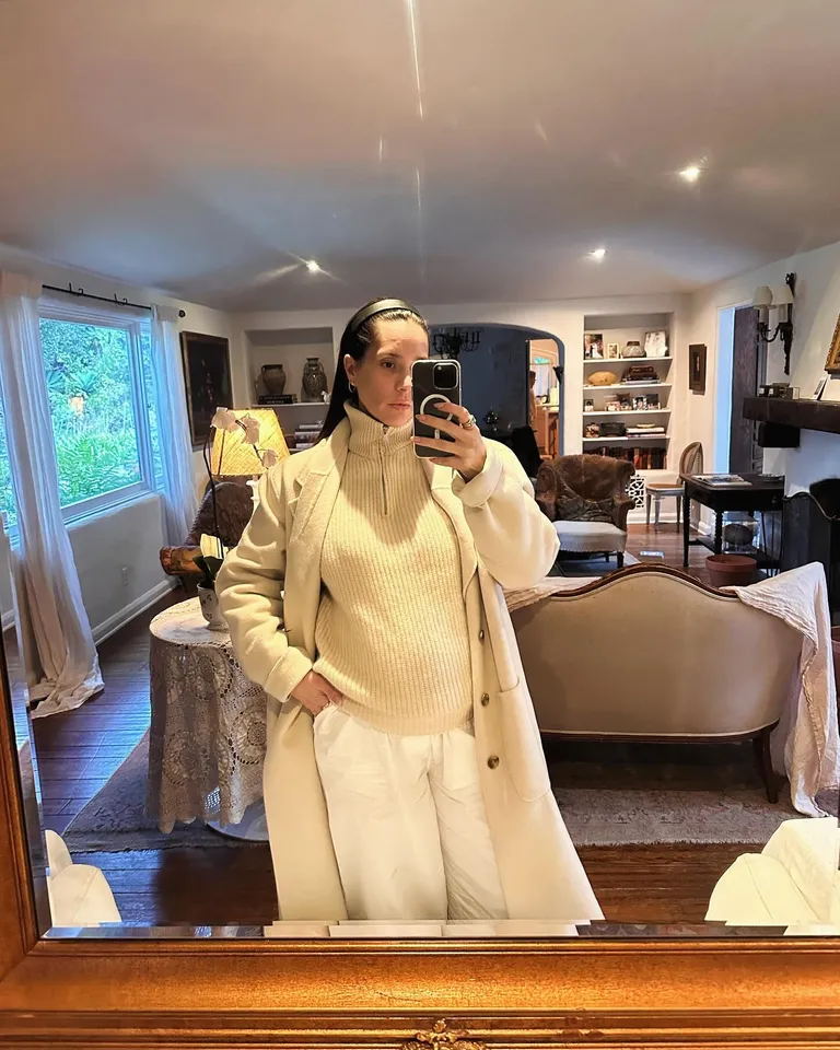 This cream-colored outfit is warm, soft, and looks very clean. The quarter-zip sweater is easy to wear and gives you a little extra warmth. The long coat on top makes it feel like a special look while still being comfortable. White pants make the outfit look bright and fresh.