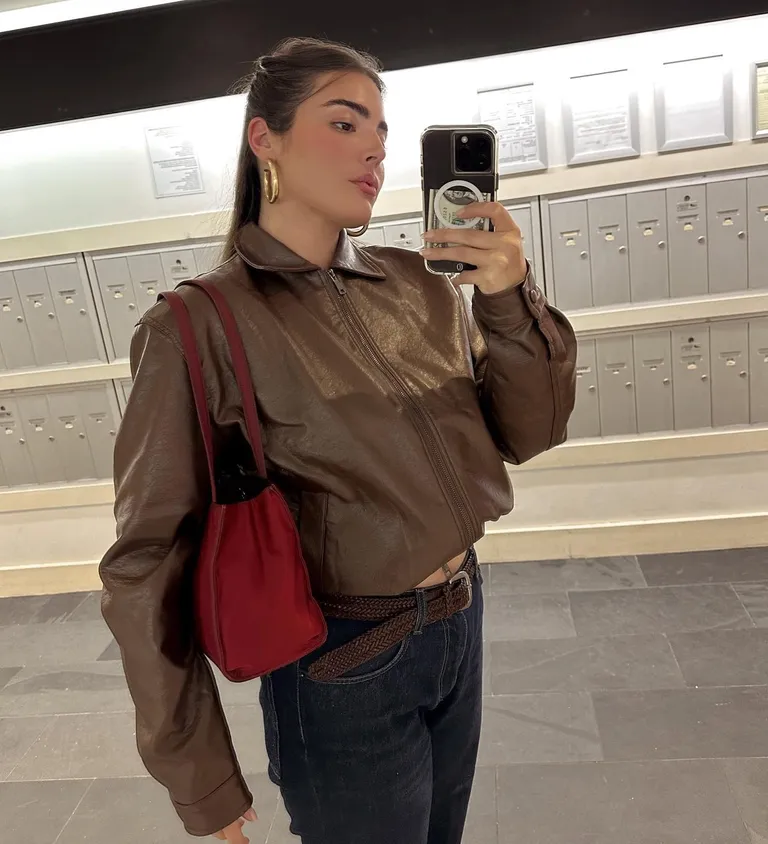 This outfit is a great pick for exploring a new city. The brown bomber jacket is warm but not too heavy, which is good for days when the weather changes. The jeans are comfy and easy to walk in, and they go with anything. The red shoulder bag adds a pop of color and gives you space for your phone, wallet, and other small things.