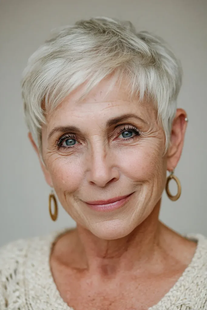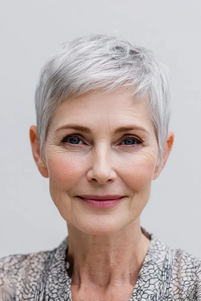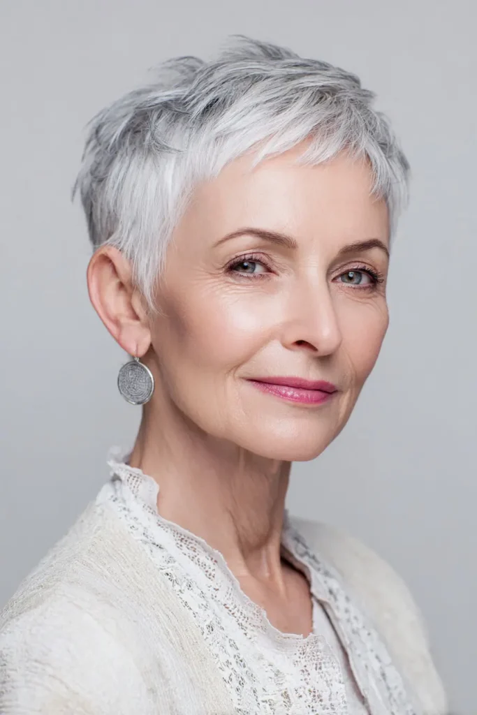 The classic pixie cut is neat, stylish, and very easy to care for. It brings attention to the eyes and cheekbones, which makes the face look bright and fresh. This haircut can also look beautiful with natural gray or white hair.